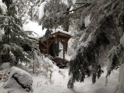 The place is Bowen Island, where there is rarely snow. More specifically, through these snow covered trees, is a yurt at Brian Hoover’s property. The framed structure is entry. The yurt itself, behind the entry, is 20 feet in diameter.