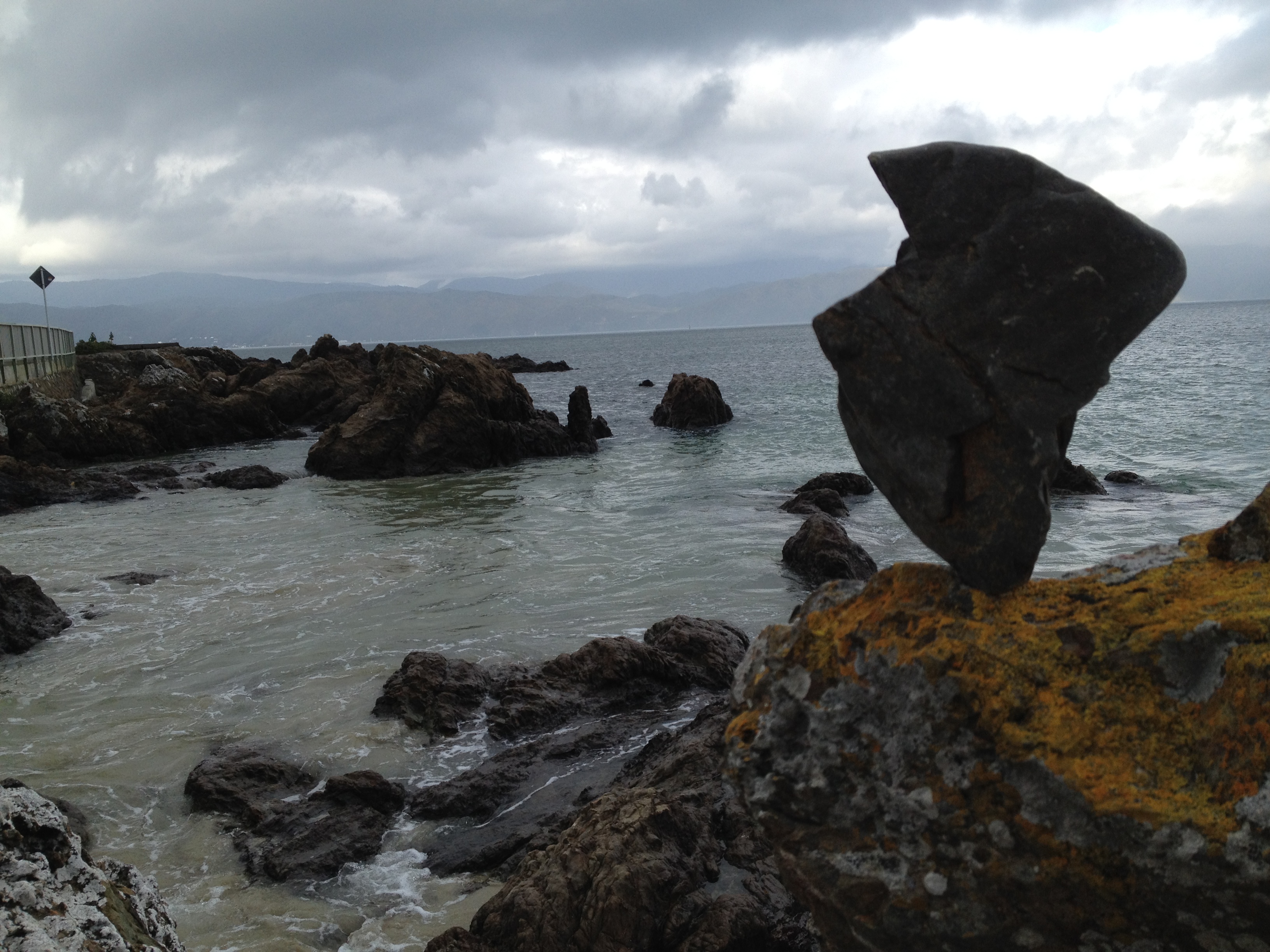 I suppose this is a good followup to yesterday’s picture of balanced stones. This is a larger stone I balanced this week, maybe 12 inches tall on an outcropping of rocks at Scorching Bay, looking into the Wellington Harbour.