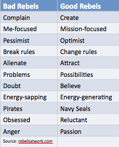 Lois and her co-auther Carmen Medina offer a chart of distinctions between “good and bad rebels.” I know it isn’t that simple. I never feel that it is. I don’t think they do either. But the chart is invitation to some very good and important conversations about some qualities that are pretty bad-assed good, no?