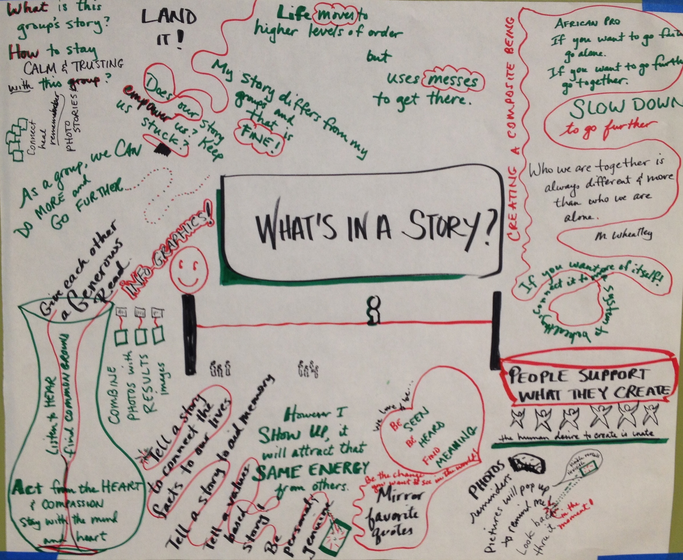 I offered the above to initially frame the huddles. That there are layers of harvest (in red, content, process, relationship, and field). That there are some principles and practices (in green, including, to help be heard in a new way, that you can’t tell it all, that harvest is an offering of meaning making).