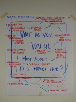 - 30 minutes Round 1 World Cafe conversation table and mapped group harvest — What do you value most about this Impact Hub?