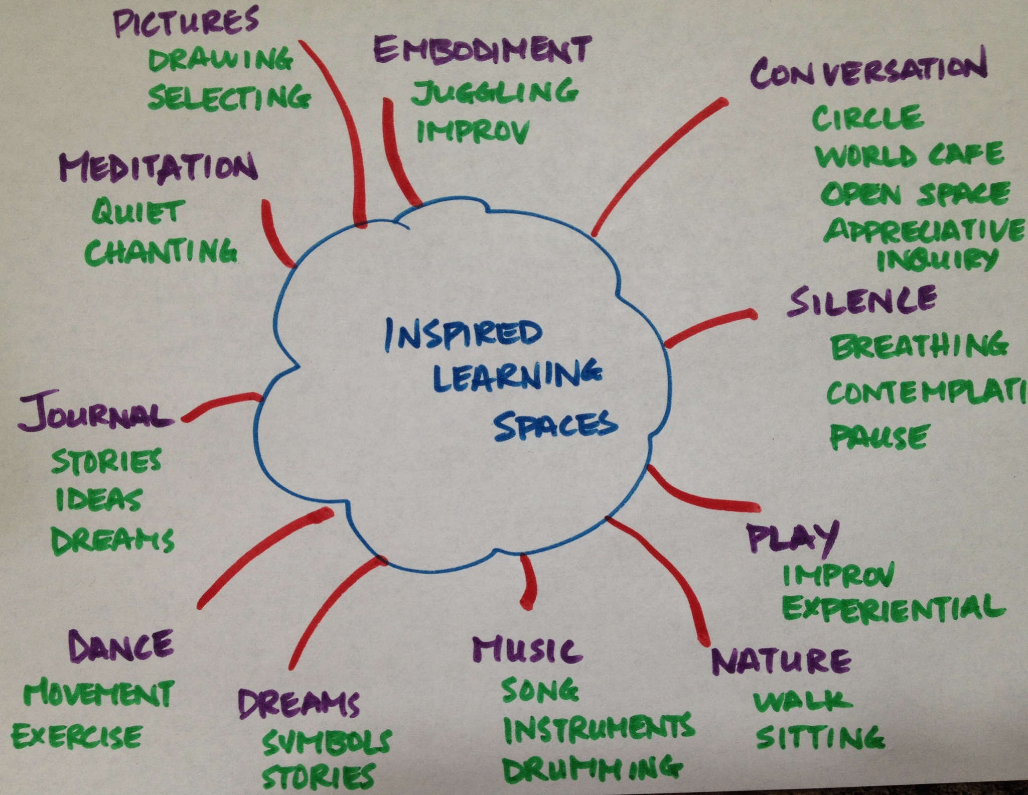 In the early 2000s Toke Moeller and I talked about these. We named some of what it takes to create good learning together. Since then, I’ve given much thought and practice to developing a wider view of inspired learning spaces. What I love about it is that it looks beyond conversational leadership. Often, from the lineage of The Art of Hosting, there is much focus on conversation as premier modality. This is important. It is one of the ways that we humans connect with each other. It is a direct challenge to command and control systems that tend to offer more mandates and dictates, more marching orders than invitations to explore.