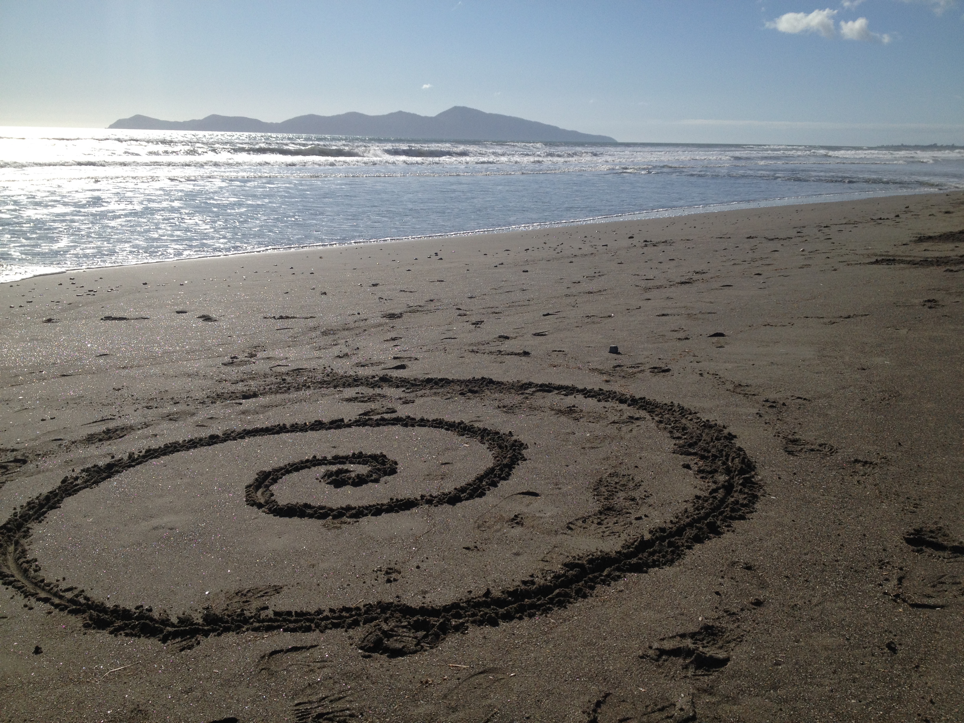 This photo includes Kapiti Island as seen from a beach in Paekakariki, about an hour north of Wellington. The body of water is the Tasman Sea. I drew the spiral, the koru in Maori, because I like the shape. It symbolizes among other things, new life with attention to both the center and the unfolding. And for this day, some simple fun with my son Isaac.