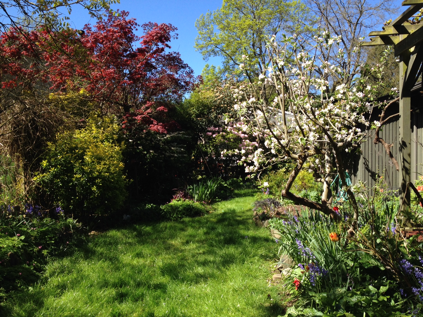 I love Washington State on a sunny day. Rainy days too, I suppose. But it’s just easier on a sunny day. The blue skies make the greens a bit greener. Sun isn’t to be taken for granted here. When it’s out, I join others in leaning into it more, like human sunflowers. Buds on trees are blossomed, awakened. Just as I am. Today, in these gardens that my partner Teresa tends so well.