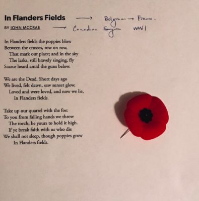 I’ve always loved the poppies that are common in Canada and other Commonwealth Countries for Remembrance Day. Pinned on lapels, colors, bags. And I’ve always loved this poem, written in World War One by a Canadian soldier and surgeon, John McCrae, that speaks of WWI battle grounds near Northern France and Belgium.