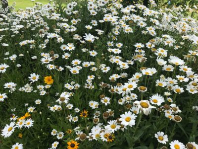 My first association with these daisies is “wild.” These flowers grow like crazy every year. I trim them to the ground in the fall, and usually once in the summer. They reseed like nobody’s business. I also thin them a bit each spring. Ain’t no risk of no daisies next year.