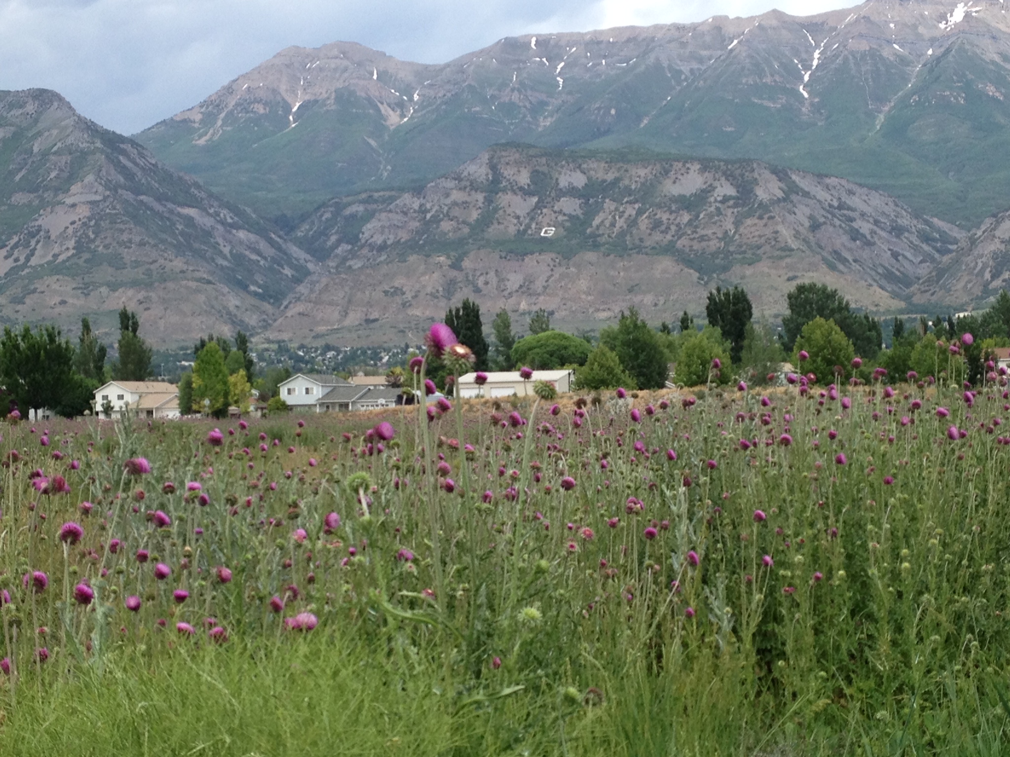 I also like the mountains in the background, which Glen was so appreciative of — “right in your own back yard!” Furthest away and tallest is Mount Timpanogos, part of the Wasatch Range. Its peek height is close to 12,000 feet. Where we are, with the thistles, is about 4,600 feet.