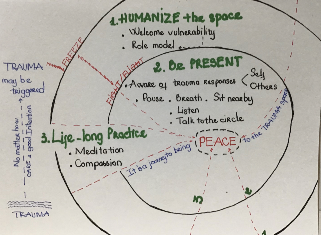 - Be Present — again, I feel this is always true. It has particular application when trauma is present. But again, generally, this statement guides me. Present to self. Present to what is happening in the middle of a circle. Present to what is emerging. Present to the subtle hints that arise when people are together, more than just the sum of the parts.