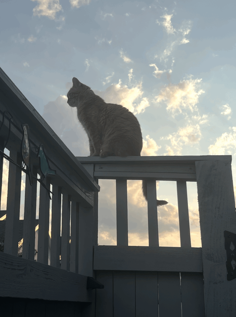 That’s Marmalade the cat. In her own wander I suppose. She’s an indoor cat looking rather regal on the outdoor back fence.