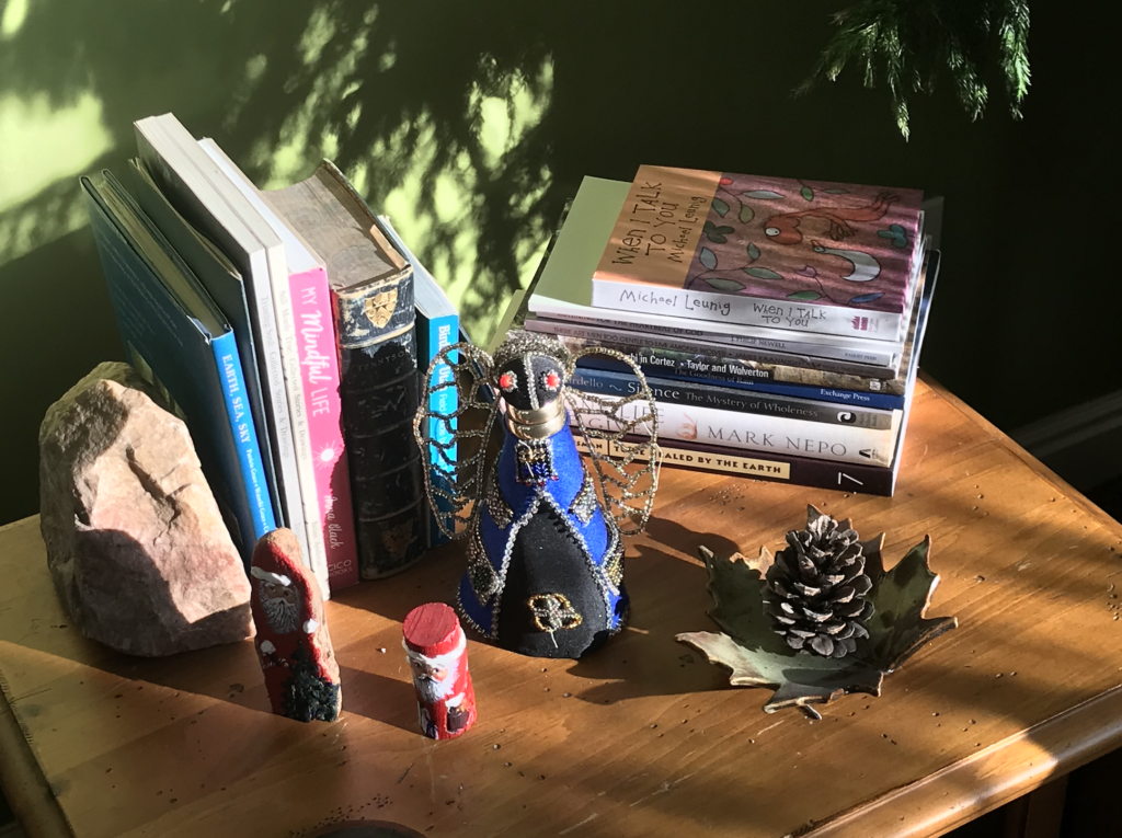 The angel given me to remind of a trip to Zimbabwe in the early 2000s. The books about mindful living, and New Zealand, and birds of Utah.